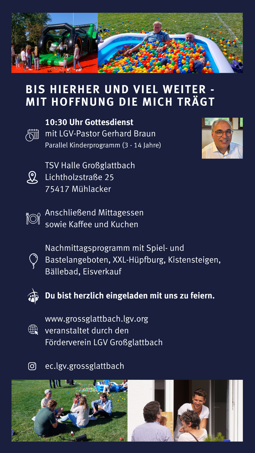 Am Sonntag, 28. September 2025 findet das Jahresfest der Liebenzeller Gemeinschaft Großglattbach in der Großglattbacher Sporthalle in der Lichtholzstraße statt. In diesem Jahr predigt Gemeinschaftspastor Gerhard Braun.